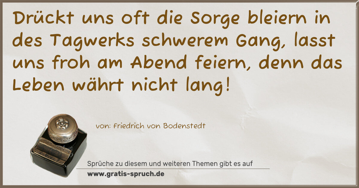 Drückt uns oft die Sorge bleiern in des Tagwerks schwerem Gang, lasst uns froh am Abend feiern, denn das Leben währt nicht lang!