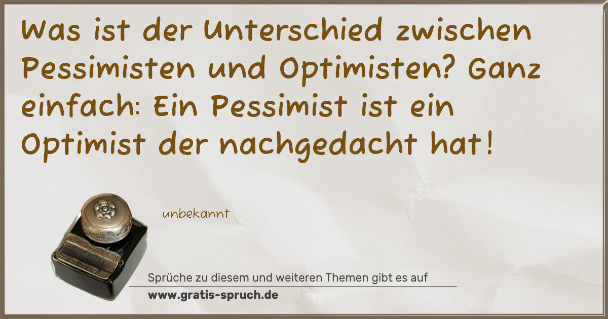 Was ist der Unterschied zwischen Pessimisten und Optimisten? Ganz einfach: Ein Pessimist ist ein Optimist der nachgedacht hat!