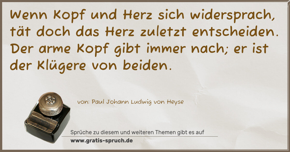 Wenn Kopf und Herz sich widersprach, tät doch das Herz zuletzt entscheiden. Der arme Kopf gibt immer nach; er ist der Klügere von beiden.