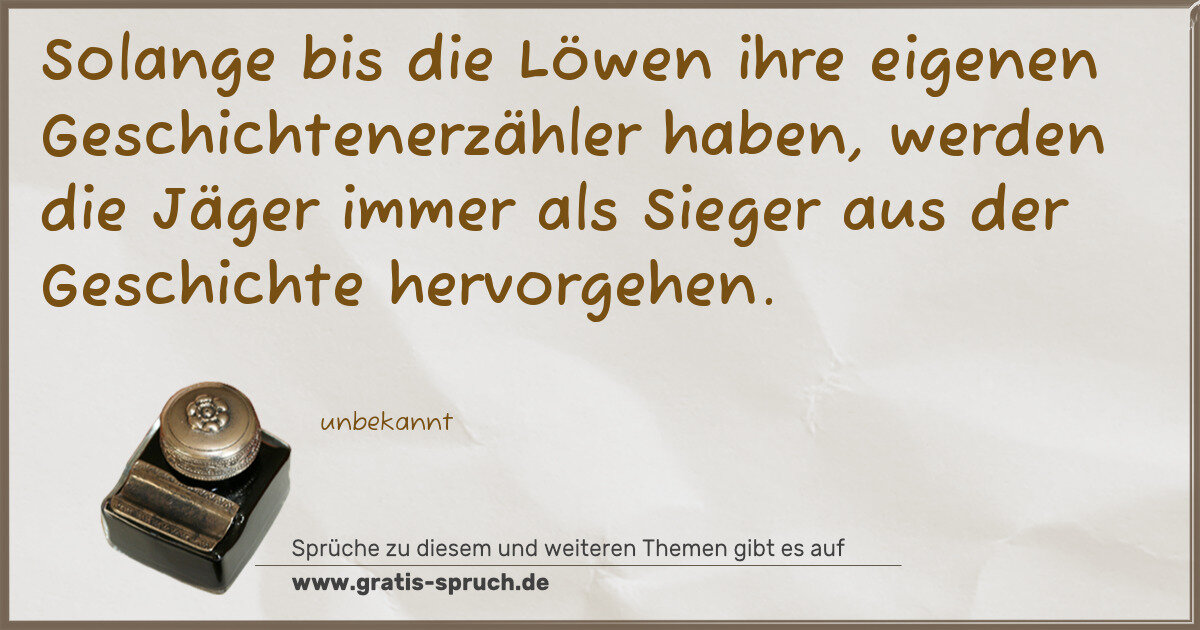 Solange bis die Löwen ihre eigenen Geschichtenerzähler haben, werden die Jäger immer als Sieger aus der Geschichte hervorgehen.