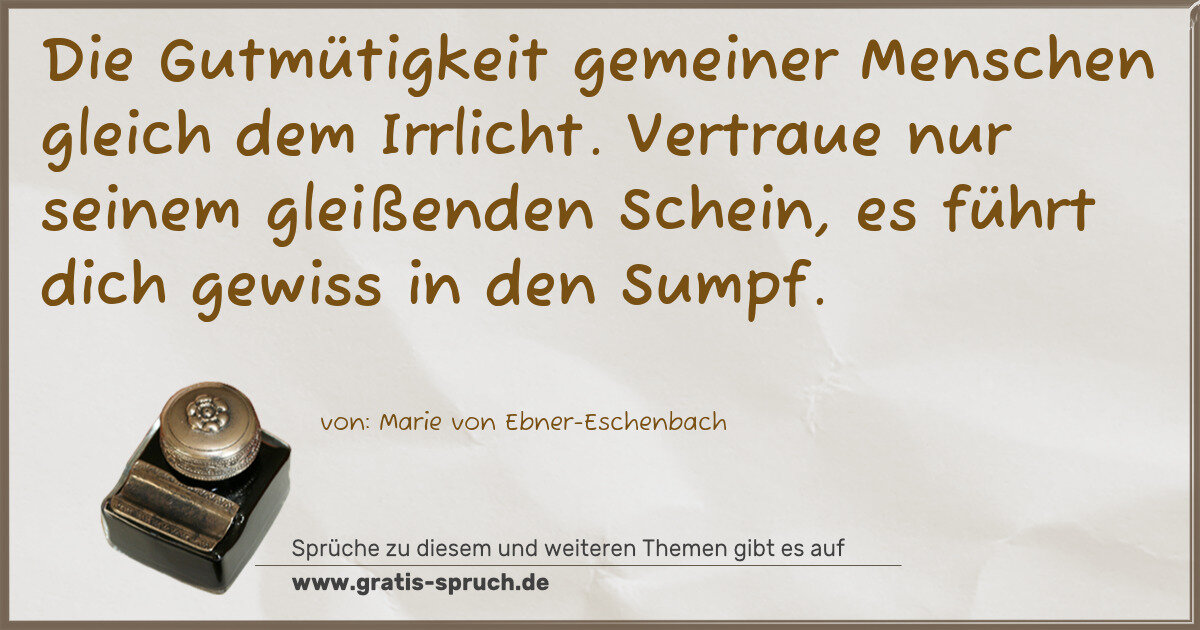 Die Gutmütigkeit gemeiner Menschen gleich dem Irrlicht. Vertraue nur seinem gleißenden Schein, es führt dich gewiss in den Sumpf.