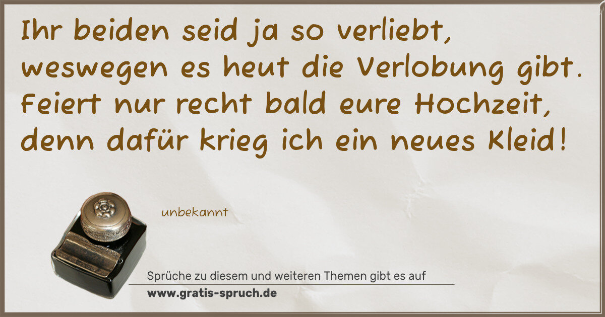 Ihr beiden seid ja so verliebt, weswegen es heut die Verlobung gibt. Feiert nur recht bald eure Hochzeit, denn dafür krieg ich ein neues Kleid!