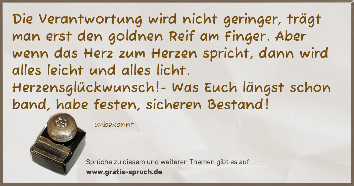 Die Verantwortung wird nicht geringer, trägt man erst den goldnen Reif am Finger. Aber wenn das Herz zum Herzen spricht, dann wird alles leicht und alles licht. Herzensglückwunsch!- Was Euch längst schon band, habe festen, sicheren Bestand!