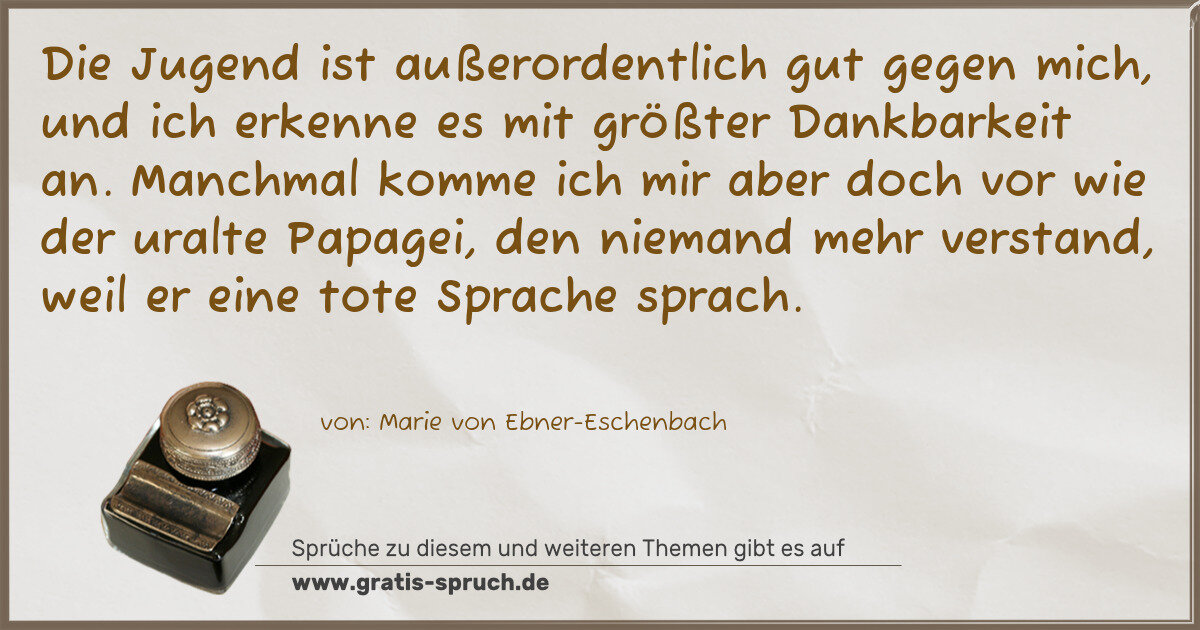 Die Jugend ist außerordentlich gut gegen mich, und ich erkenne es mit größter Dankbarkeit an. Manchmal komme ich mir aber doch vor wie der uralte Papagei, den niemand mehr verstand, weil er eine tote Sprache sprach.